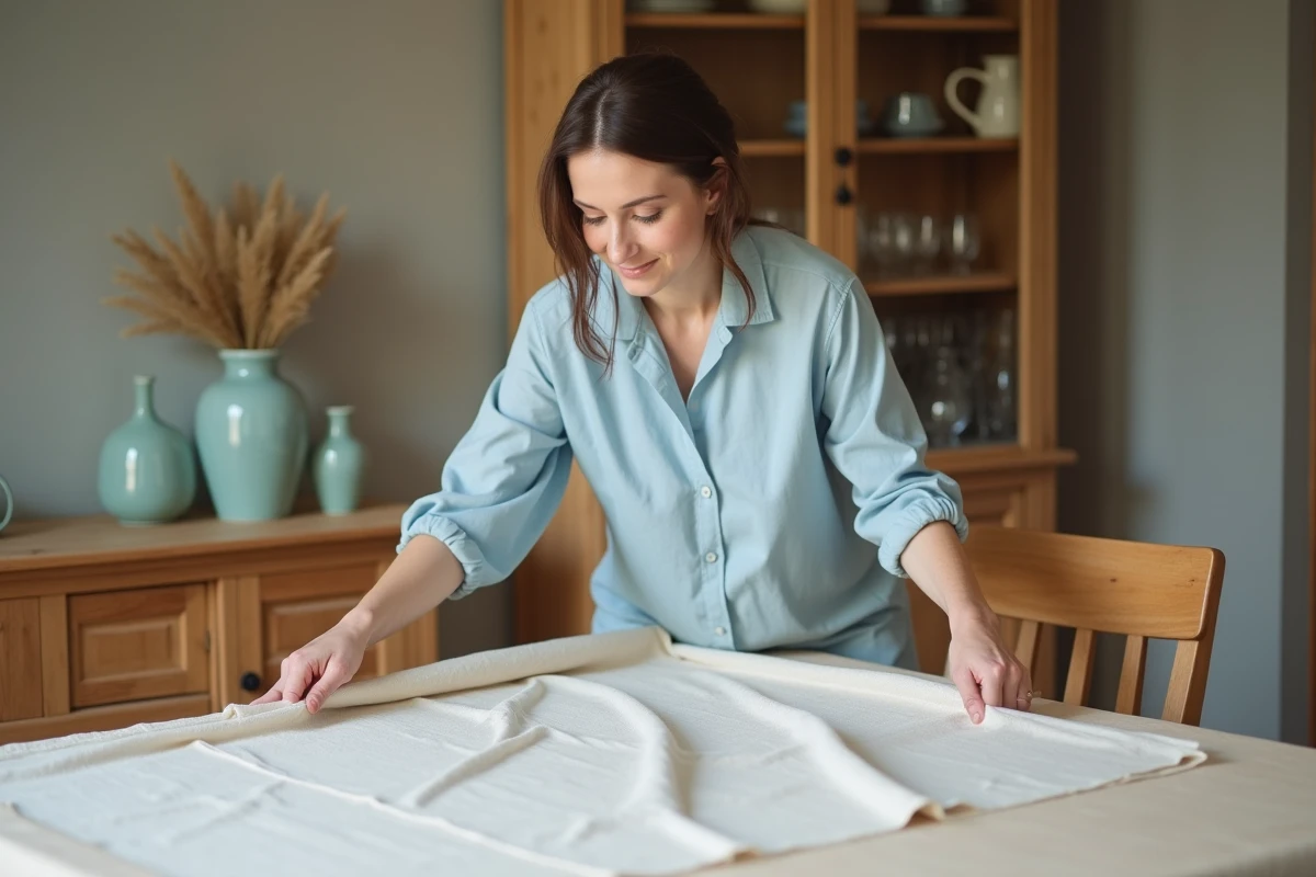 Pour le rangement, deux options s’offrent à vous : un pliage soigné ou, mieux encore, suspendre vos nappes pour éviter ces plis tenaces qui gâchent l’effet. En cas de tache impromptue, réagissez immédiatement avec de l’eau froide et un peu de savon doux – cette réactivité peut sauver bien des situations !